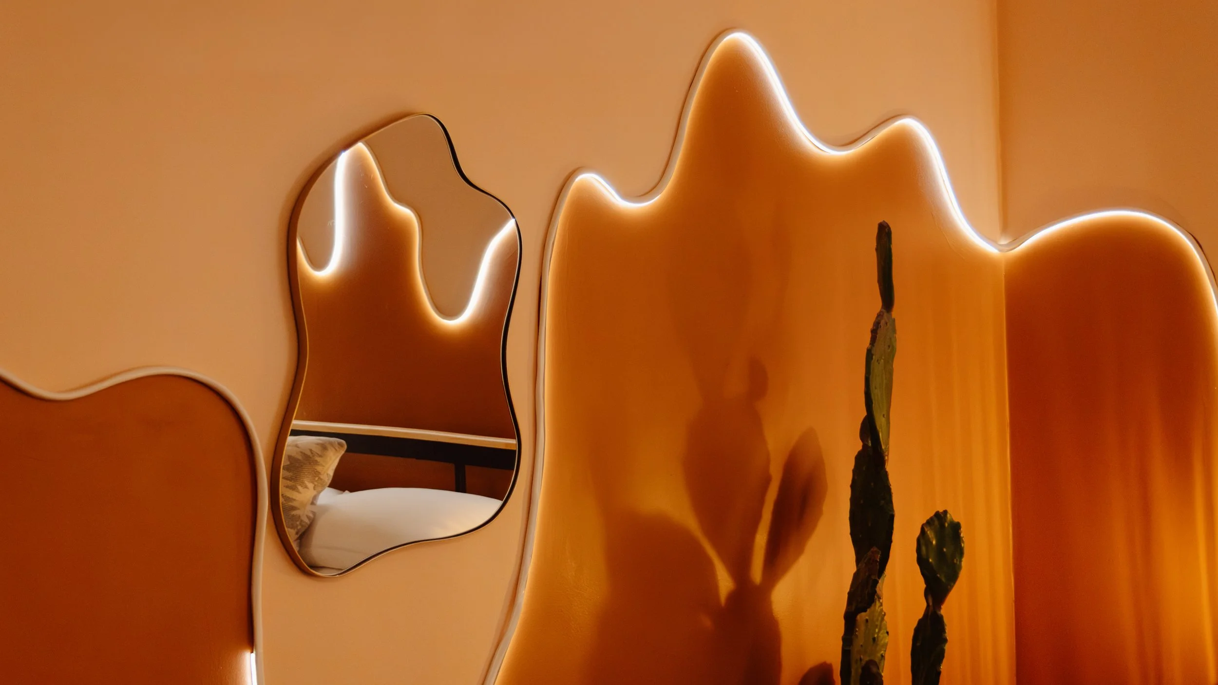 Decorative wall with irregularly shaped mirrors, orange background, and cactus shadows.